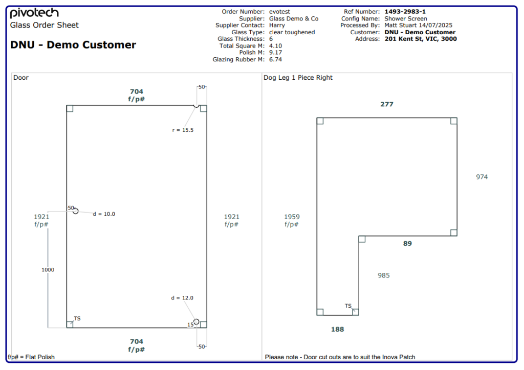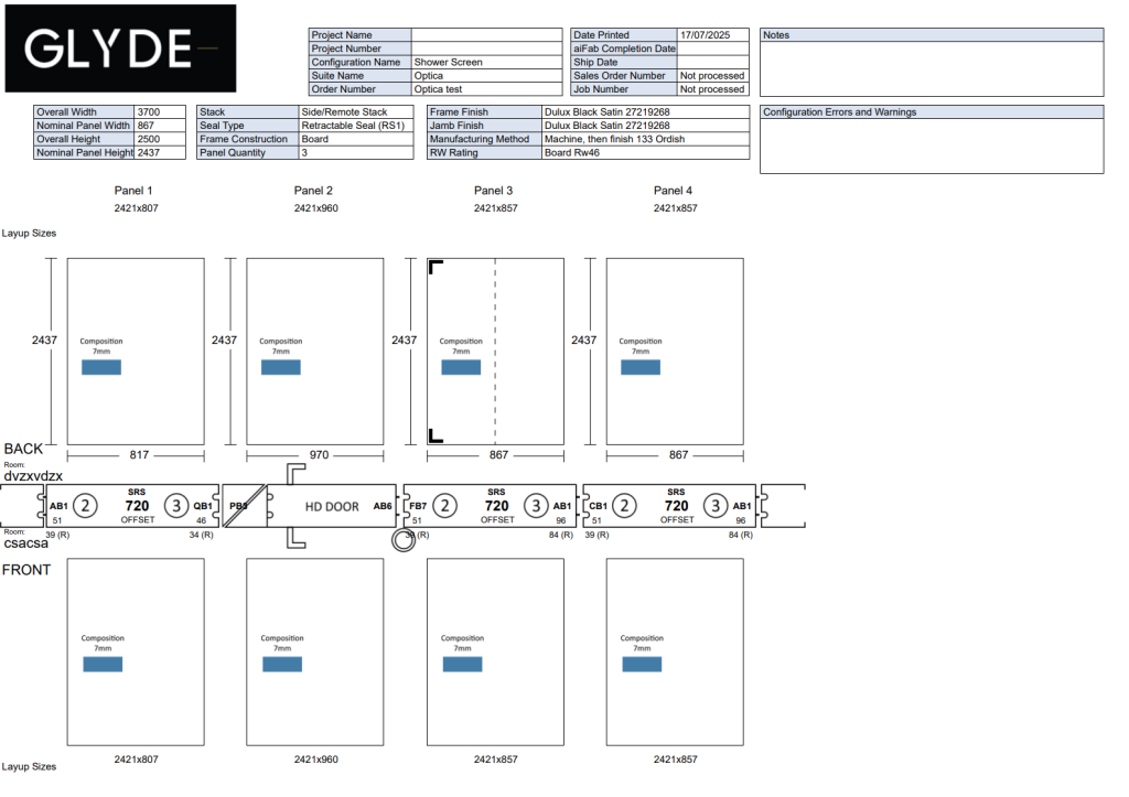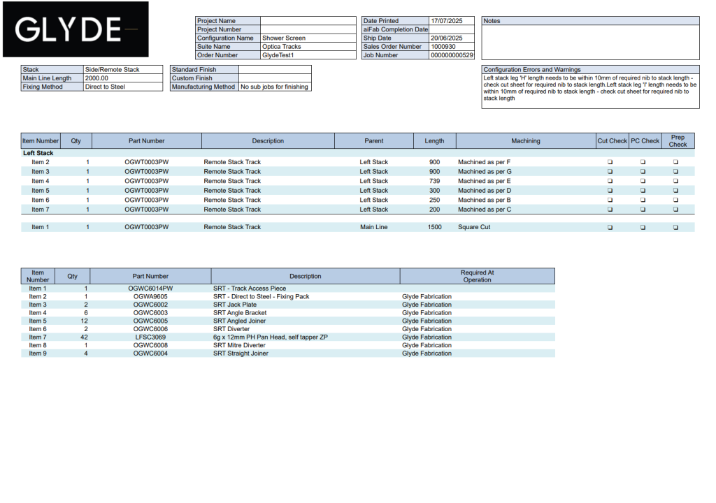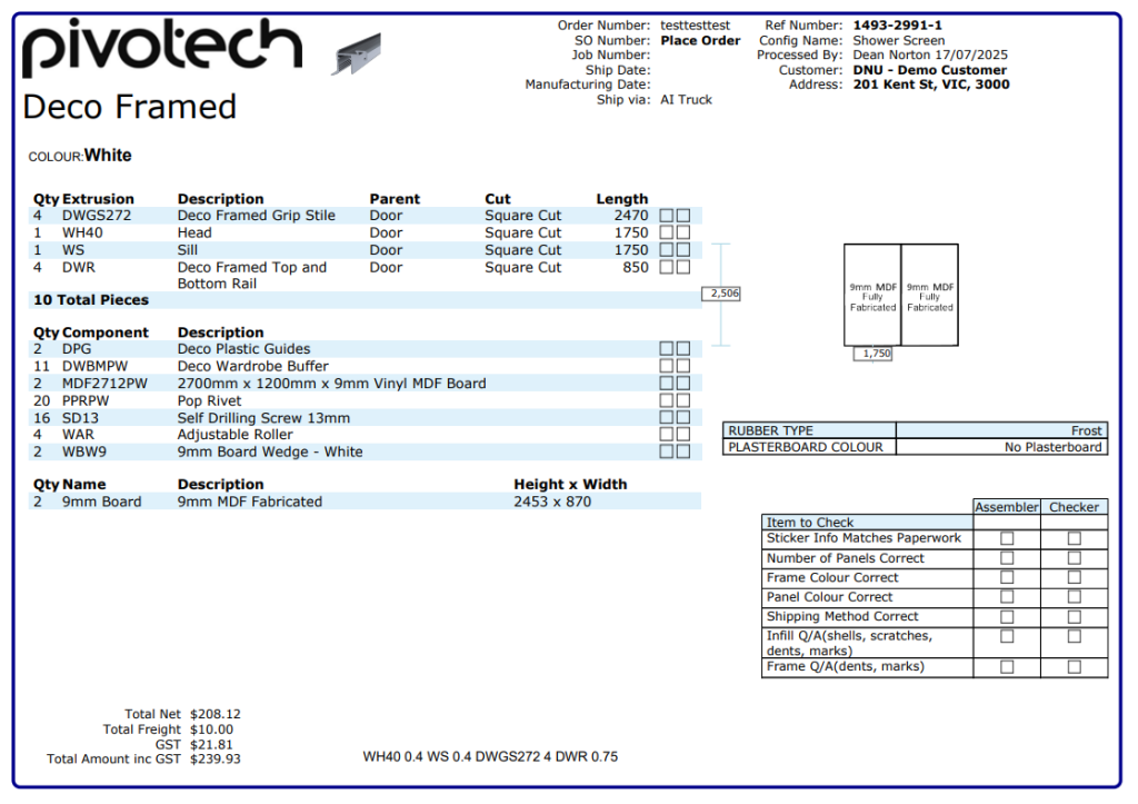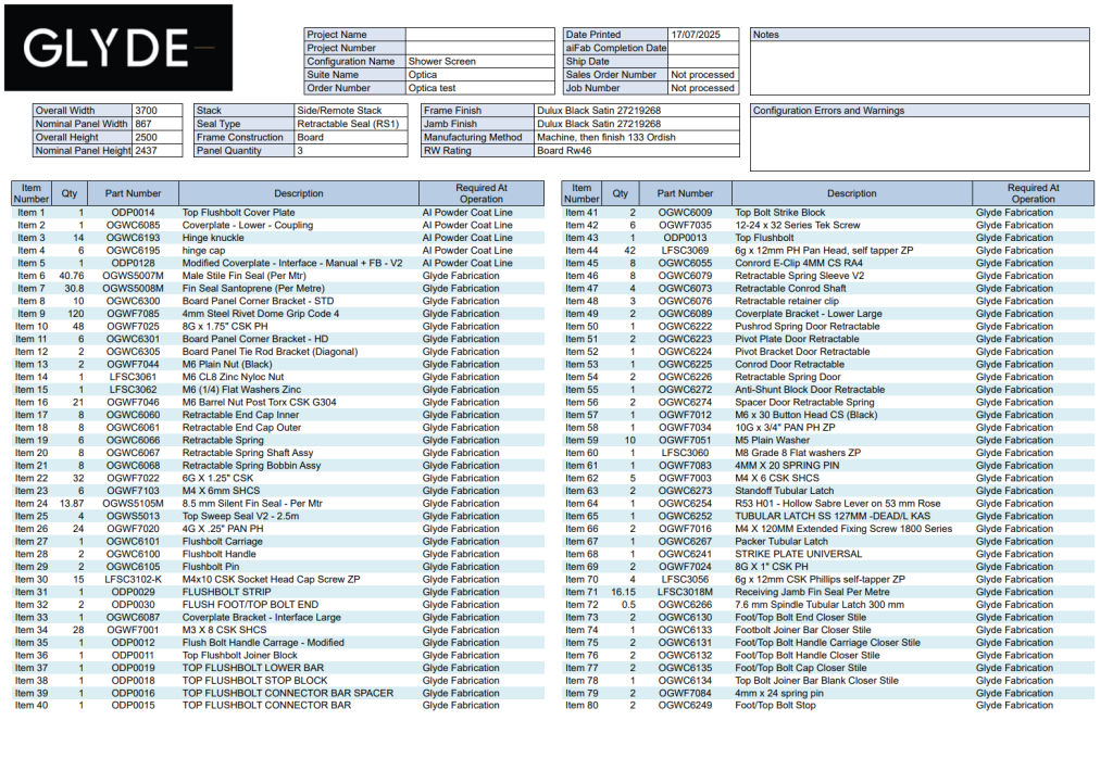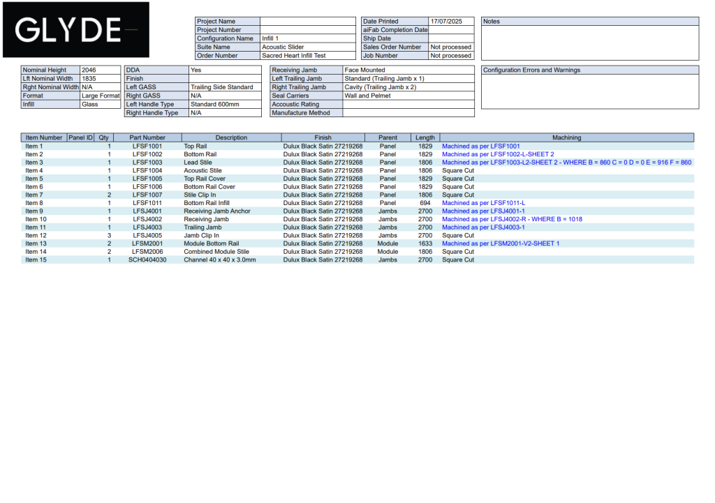 Every configuration produces a complete set of manufacturing documents automatically. From cut sheets and BOMs to machining instructions and glass sizes, the output is perfectly matched to the exact product that was configured. No manual drafting, no double-handling — just accurate, production-ready information generated the moment a job is confirmed.